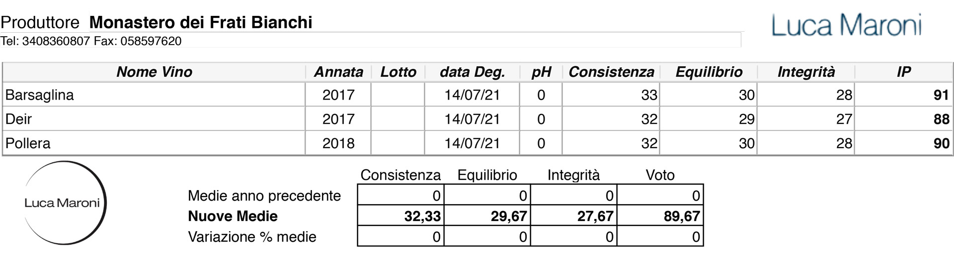 Luca Maroni, guru dell’analisi sensoriale applicata al vino, ha valutato i nostri vini Barsaglina, Deir e Pollera: